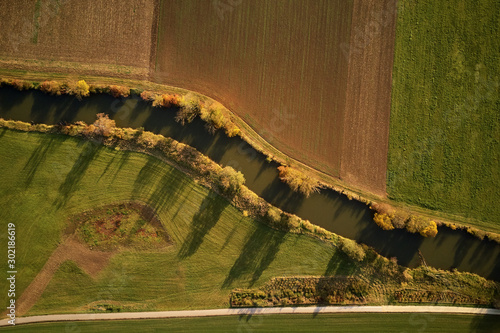 Trees by the stream in autumn from above