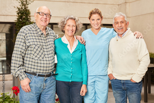 Gruppe Senioren im Gespräch mit Altenpflegerin