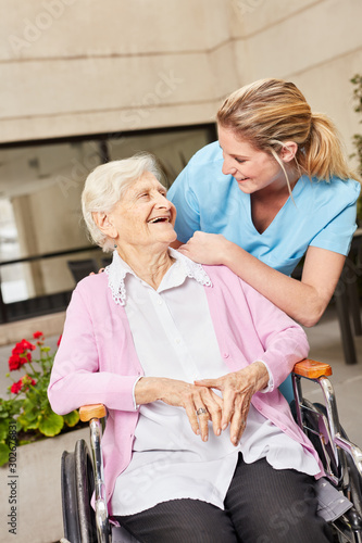 Glückliche Seniorin im Rollstuhl mit Pflegekraft