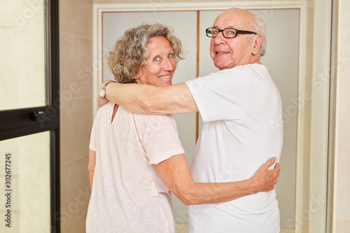 Pflegekraft mit Tablet und eine Gruppe Senioren