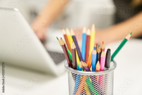 Variety of colorful pencils organized neatly in transparent glass jars on desk