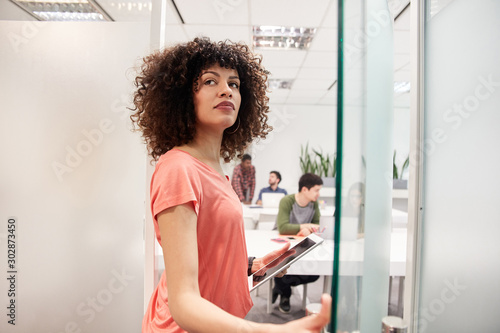 Junge Business Frau mit Tablet im Großraumbüro