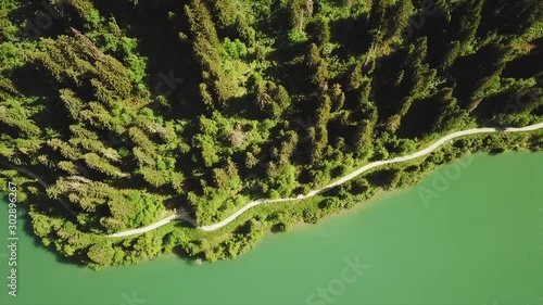 Aerial view of bridge spanning a pristine mountain lake with lush greenery