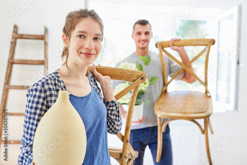 Junge Frau trägt mit ihrem Freund eine Tischplatte