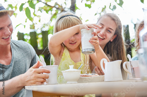 Blondes Mädchen spielt mit dem Zuckerstreuer