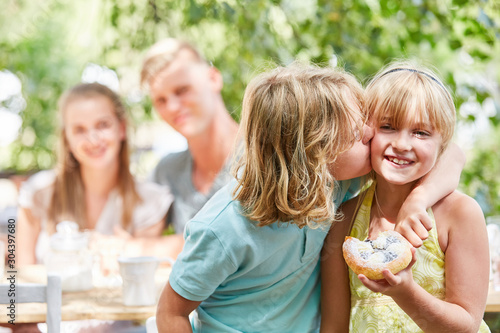 Boy kisses his sister on the cheek