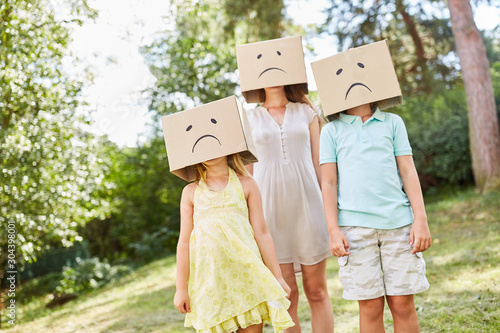 Familie zeigt bunte Zeichnung mit Eigenheim