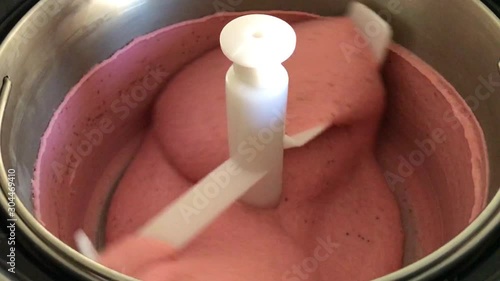 Strawberry ice cream stirring in ice cream maker