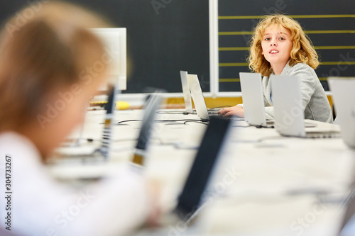 Mädchen in Schule steht vor Tafel mit Muskeln