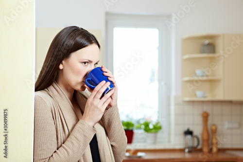 Lachende Frau trinkt Kaffee oder Tee in Küche