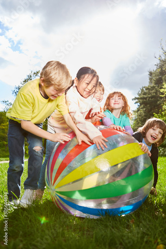 Gruppe Kinder spielt ausgelassen mit einem Ball