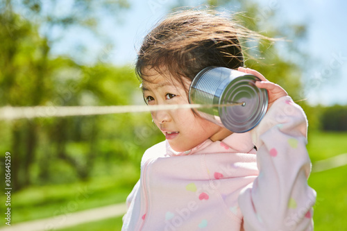 Asiatisches Mädchen spricht in ein Dosentelefon