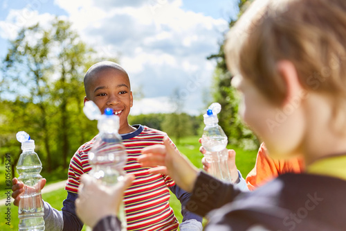 Kinder erfrischen sich mit Wasser aus Flaschen