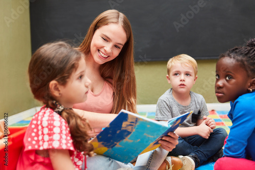 Lehrer und Kinder haben Spaß beim Vorlesen