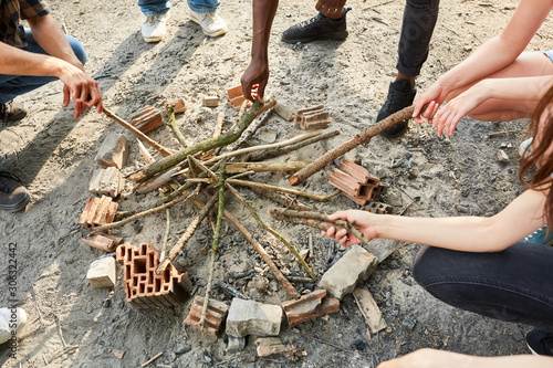 Gruppe junger Leute bereitet ein Lagerfeuer vor