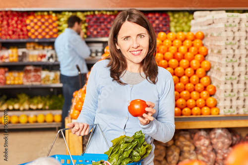Kundin liest Etikett auf einem Produkt im Supermarkt