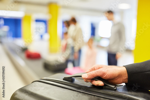 Hand holds a suitcase while picking up from the luggage belt