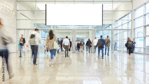 Anonymous business people hurry through trade fair hall