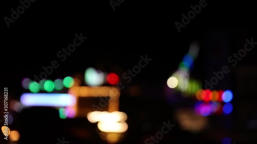 Pan shot of colorful defocused fairground lights at night