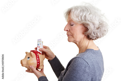 Seniorin steckt Geld in Sparschwein