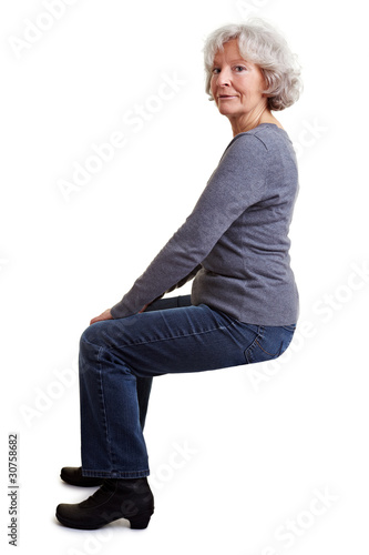 Seniorin lehnt an imaginärer Wand