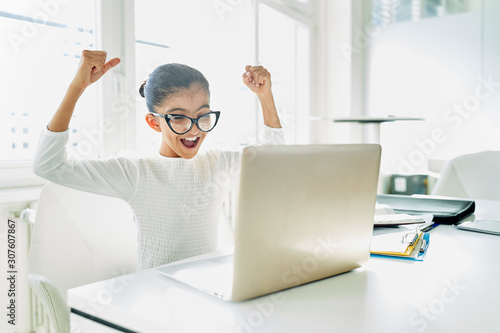 Mädchen als Geschäftsfrau vor Laptop Computer