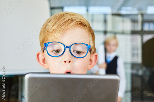 Afrikanischer Junge ballt die Fäuste am Laptop