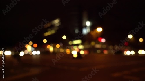 Defocused view of intersection in Berlin at night with oncoming traffic