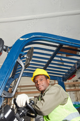 Afrikanischer Arbeiter auf einem Gabelstapler