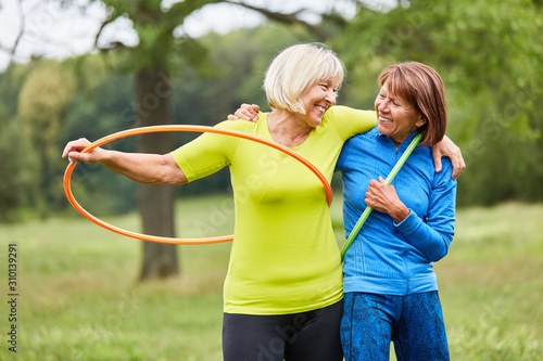 Zwei Senior Frauen machen Reifen Gymnastik