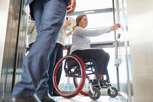 Frau als Rollstuhlfahrer drückt Taste im Fahrstuhl