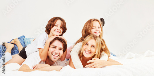 Glückliche Familie mit zwei Kindern im Bett