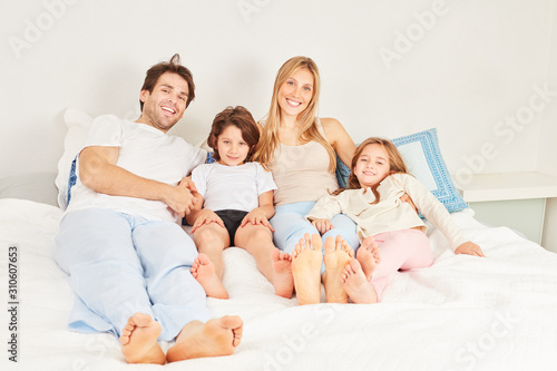Familie mit zwei Kindern im Schlafanzug im Bett