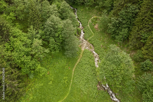 Aerial view of river in forest with mountain as Asian landscape panorama (Generative AI)