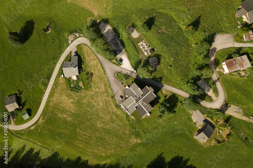Aerial view of houses and road in small village