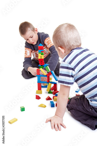 zwei Brüder spielen mit Bauklötzen