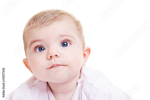 Joyful Russian baby boy with light golden hair wearing a blue onesie