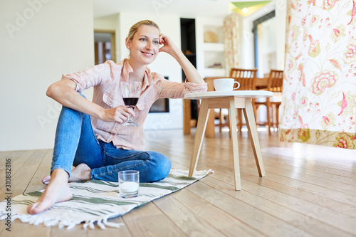 Junge Frau trinkt Rotwein im Wohnzimmer
