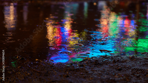 Reflexion bunter Lichter in Pfütze als Hintergrund