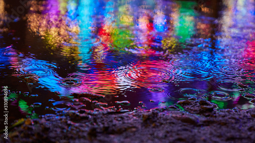 Pfütze nachts bei Regen auf Jahrmarkt oder Kirmes