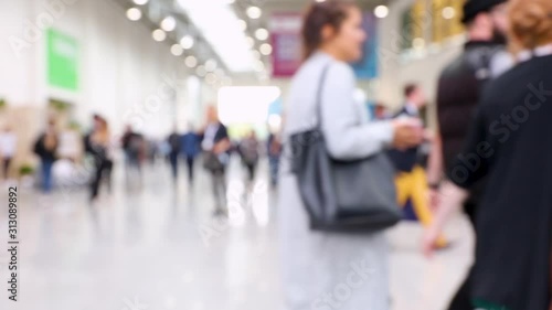 Blurred view of crowd of trade fair visitors in exhibiton hall