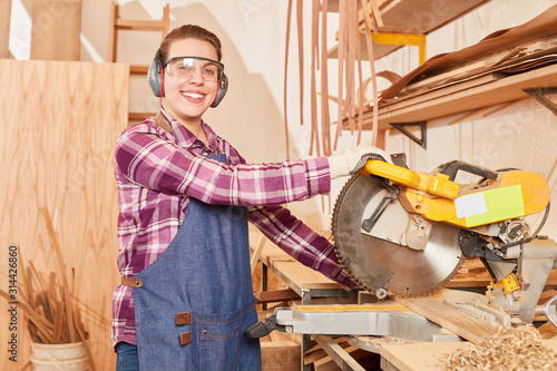 Schreiner Lehrling arbeitet mit der Kappsäge