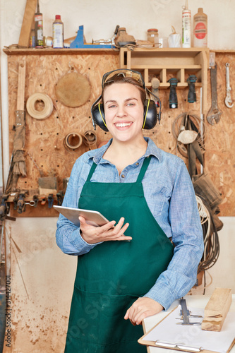 Zufriedene Handwerker Frau als Schreiner Lehrling