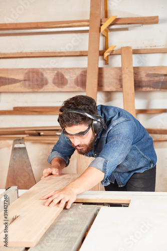 Schreiner Lehrling sägt Holz an der Kreissäge