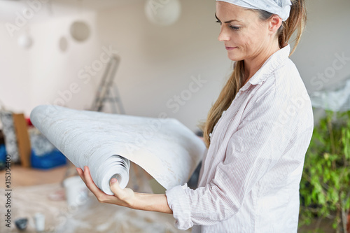 Woman as a home improvement when choosing a wallpaper