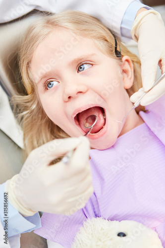 Zahnarzt mit Spiegel untersucht Zähne von Mädchen