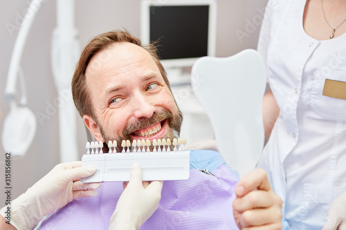 Glücklicher Mann nach Zahnaufhellung mit Spiegel