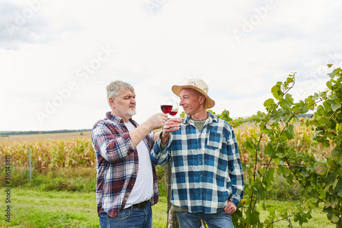Zwei Winzer trinken zusammen ein Glas Rotwein