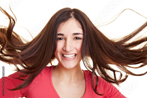 Beautiful woman with radiant, healthy long hair in motion, showcasing vitality and elegance against a simple background