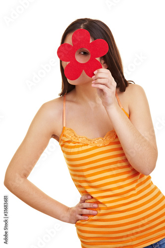 Frau schaut durch Filzblume
